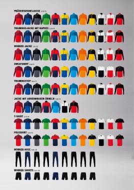 PRÄSENTATIONSJACKE Seite 84 TRAININGSJACKE MIT KAPUZE Seite 86 WORKER JACKE Seite 88 SWEATSHIRT Seite90 TRAININGSTOP Seite 92 JACKE MIT ABNEHMBAREN ÄRMELN Seite 94 T-SHIRT Seite 96 POLOSHIRT Seite 98 WORKER HOSE Seite 100 WORKER SHORTS Seite 100