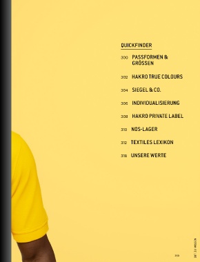 QUICKFINDER GUT ZU WISSEN 300 PASSFORMEN & GRÖSSEN 302 HAKRO TRUE COLOURS 304 SIEGEL & CO. 306 INDIVIDUALISIERUNG 308 HAKRO PRIVATE LABEL 310 NOS-LAGER 312 TEXTILES LEXIKON 318 UNSERE WERTE 299